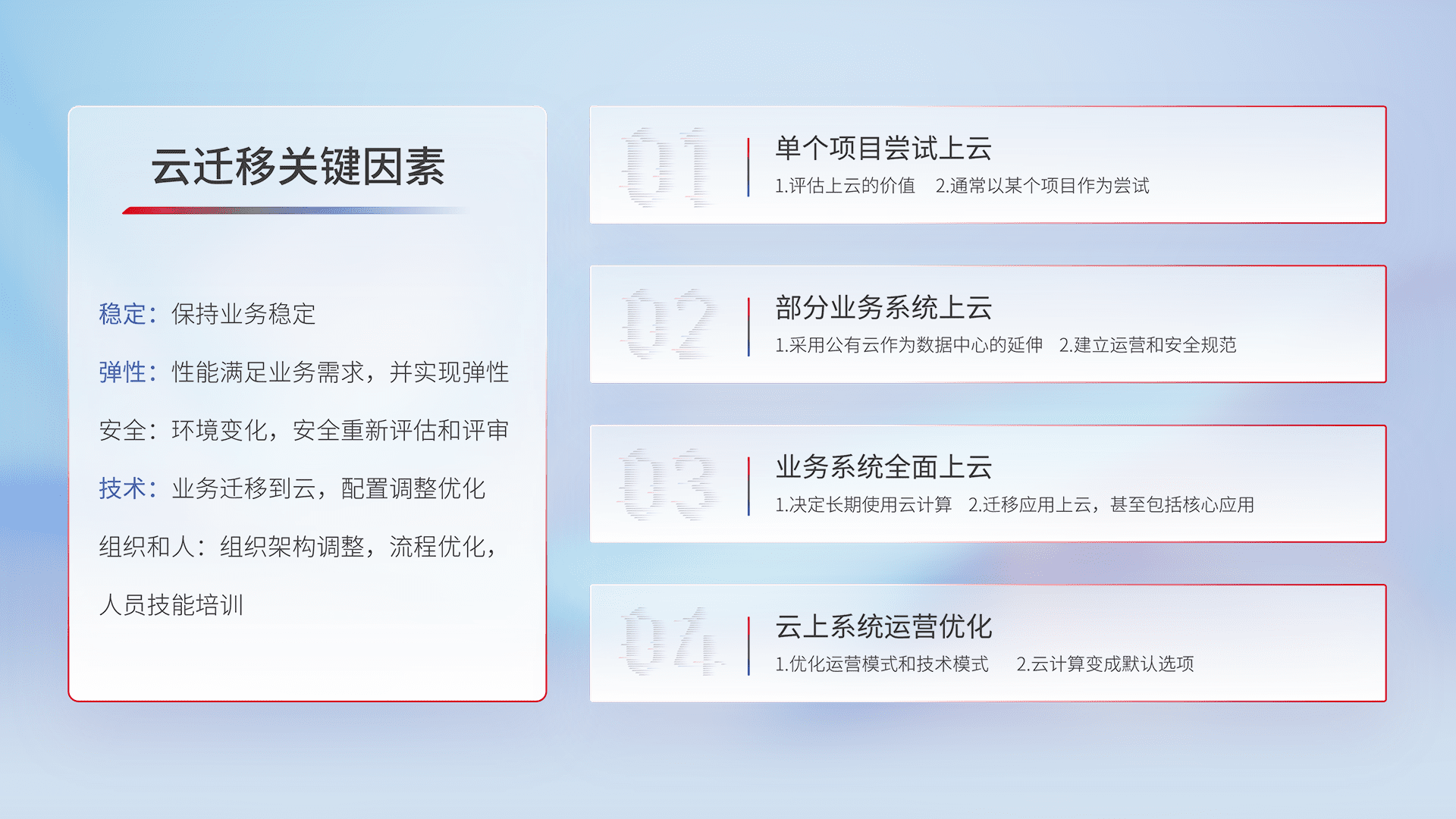 结合实际业务,,,,从规划设计、、、云平台选型、、、、云原生改造、、数据迁移、、集成交付,,迁移全过程为客户识别最佳上云路径,,,,做好风险识别管理,,,,设计网络架构、、、身份权限、、、安全审计合规、、操作审计、、、日志审计、、、监控告警策略、、多站点容灾设计等,,对云上基础设施进行整体规划,,提升IT治理水平,,,,以满足弹性、、、高可用、、、、高性能的需求。。