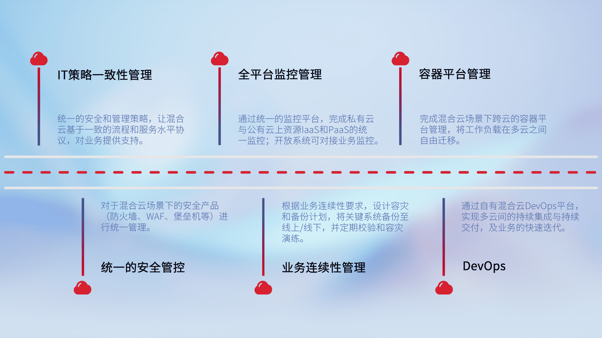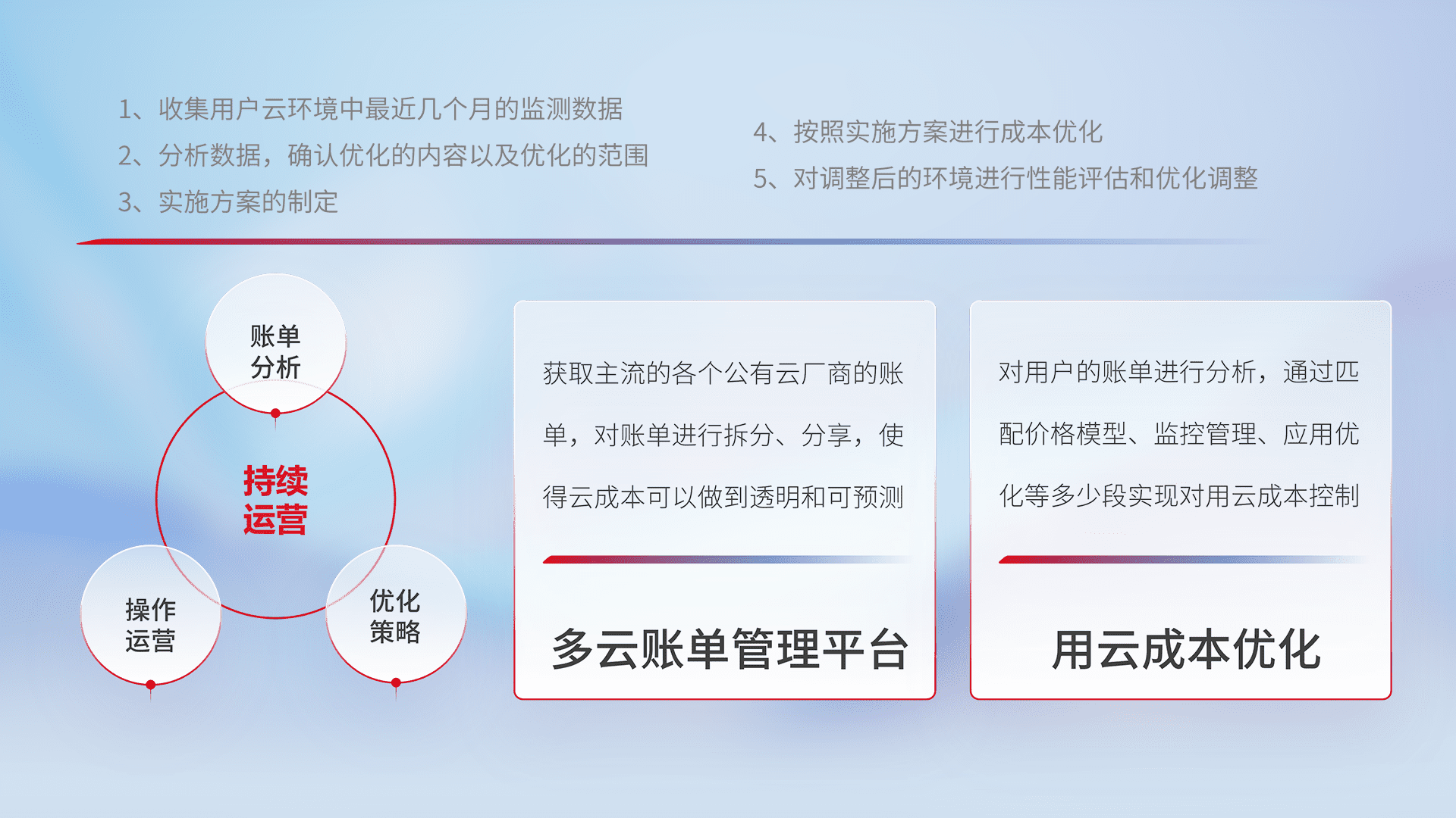 通过多云纳管,,以统一的资源数据模型把客户的云资源进行抽象和封装,,,,进而实现对多云资源的统一操作,,,,保障云资源管理的可靠性、、稳定性与可用性。。。。量身定制化运维内容,,,配置、、开发运维、、、补丁管理、、、备份、、、监控、、认证和访问管理、、、审计和日常巡检等,,,保障在用云过程中的可靠度,,,,稳定度以及高可用率。。。。